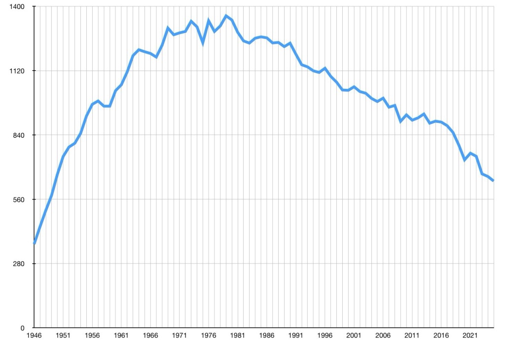 Wenn man sich die Entwicklung anschaut, dann war der Peak 1979 mit 1355,7 Mt (Megatonnen). Vorher ist sie von der Nachkriegszeit an erheblich gestiegen, ähnlich der Entwicklung der Wirtschaftsleistung. Seit 1979 haben sich die Emissionen bis 2025 halbiert auf 639 Mt.. Markante Reduzierungen sind von 1979 – 1982, wohl infolge des Ölpreisschocks und ab 2016 bis 2025, wahrscheinlich infolge des Pariser Klimaschutzabkommens, wobei es durch Corona einen Wirtschaftseinbruch gab und 2024 erst wieder das wirtschaftliche Niveau von 2019 erreicht worden ist.