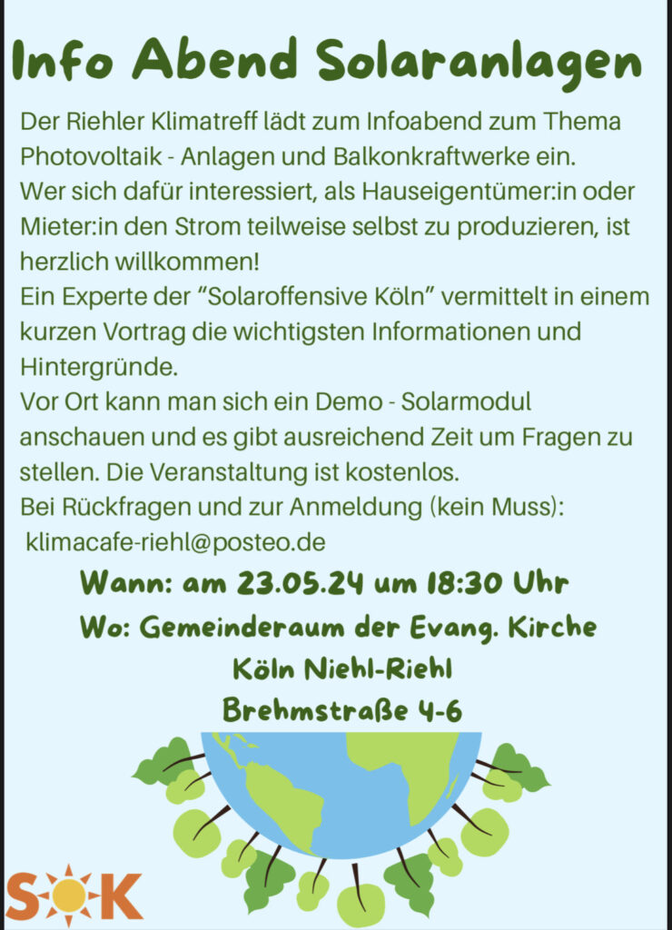 Alles, was Du über Balkonkraftwerke und Solaranlagen wissen musst Der Riehler Klimatreff lädt zum Infoabend zum Thema Photovoltaik-Anlagen und Balkonkraftwerke ein. Wenn Du Dich dafür interessiert, als Hauseigentümer*in oder Mieter*in … Riehl tankt Sonnenstrom weiterlesen